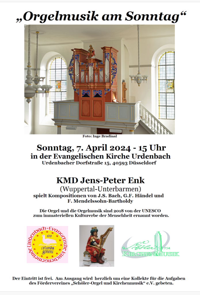 07.04.2024 um 15 Uhr: Orgelmusik am Sonntag KMD Jens-Peter Enk (Wuppertal-Unterbarmen) spielt Kompositionen von J.S. Bach, G.F. Händel und F. Mendelssohn-Bartholdy.