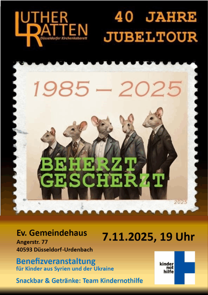 07.11.2025 um 19 Uhr: Beherzt gescherzt – LutherRatten 40 Jahre Jubeltour Benefizveranstaltung der Kindernothilfe für Kinder aus Syrien und der Ukraine