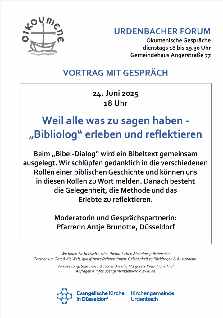 Beim „Bibel-Dialog“ wird ein Bibeltext gemeinsam ausgelegt. Wir schlüpfen gedanklich in die verschiedenen Rollen einer biblischen Geschichte und können uns in diesen Rollen zu Wort melden. Danach besteht die Gelegenheit, die Methode und das Erlebte zu reflektieren.