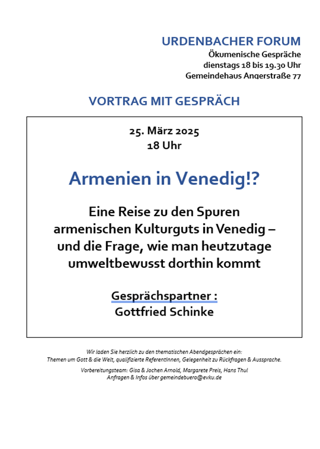 25.03.2025 um 18 Uhr: Urdenbacher Forum Armenien in Venedig!? Eine Reise zu den Spuren armenischen Kulturguts in Venedig – und die Frage, wie man heutzutage umweltbewusst dorthin kommt.