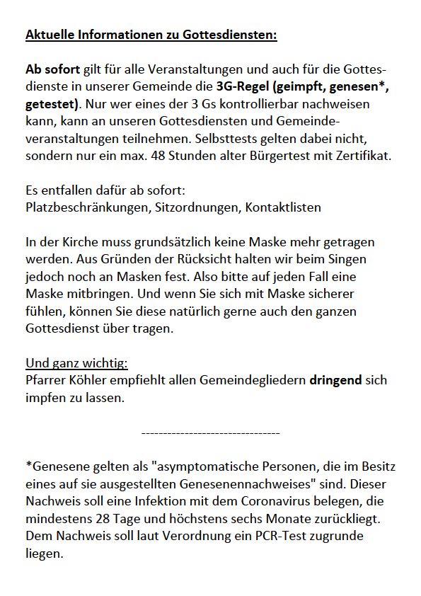 Aktuelle Informationen zu Gottesdiensten: 3G-Regeln ab sofort gültig