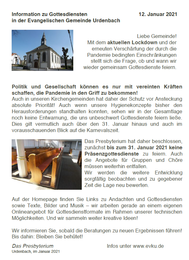 Aktuelle Informationen zu Gottesdiensten Bitte beachten Sie die aktuellen Informationen des Presbyteriums zu Veranstaltungen und Gottesdiensten der Gemeinde: Online-Angebote im Januar