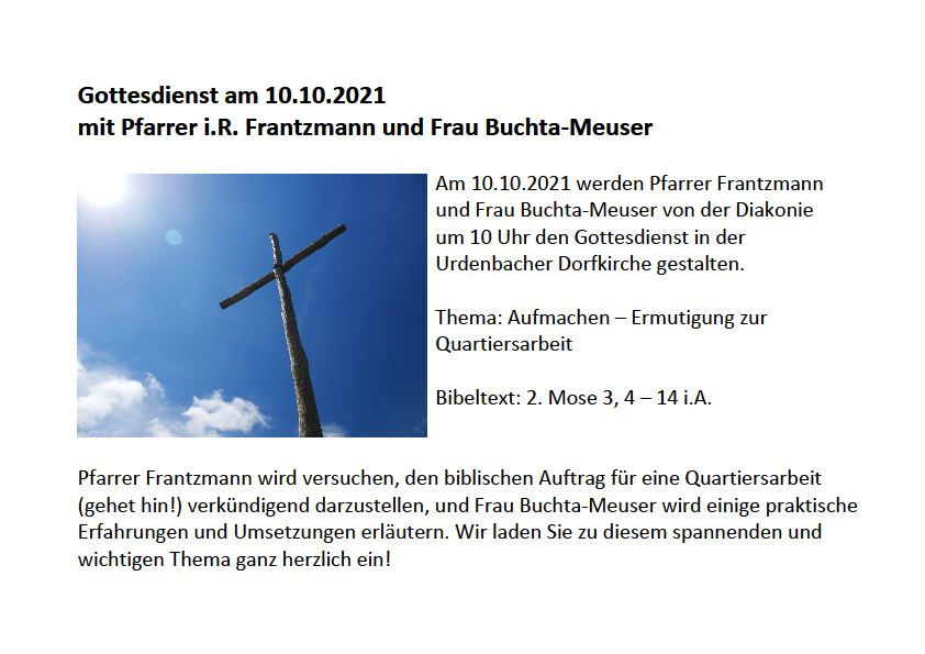 Ankündigung: Gottesdienst am 10.10.2021 mit Pfarrer Frantzmann und Frau Buchta-Meuser