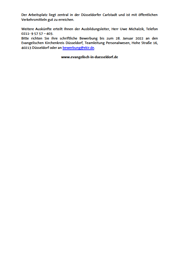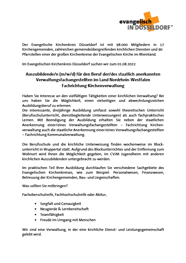 Auch im kommenden Ausbildungsjahr 2022 bietet der Kirchenkreis Düsseldorf Ausbildungsplätze zum Beruf der/des staatlich anerkannten Verwaltungsfachangestellen im Land NRW mit der Fachrichtung Kirchenverwaltung an. Ab sofort kann man sich um die Ausbildungsplätze bewerben. Alle weiteren Informationen finden sich in der folgenden Stellenausschreibung.
