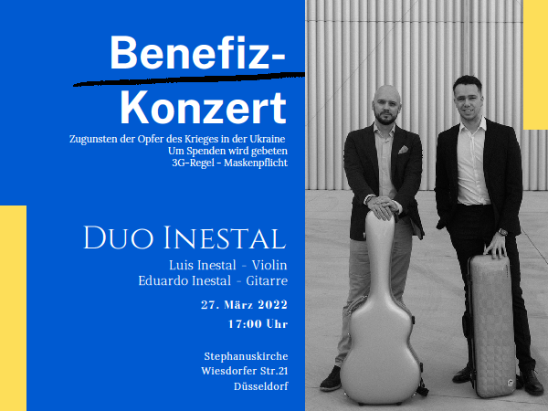 Es spielt das Duo Inestal. Um den vielen vom Krieg in der Ukraine Betroffenen eine Hilfe zu bieten, haben sich Luis Inestal (Violine) und Eduardo Inestal (Gitarre) entschlossen, zugunsten dieser Menschen ein Konzert zu geben.