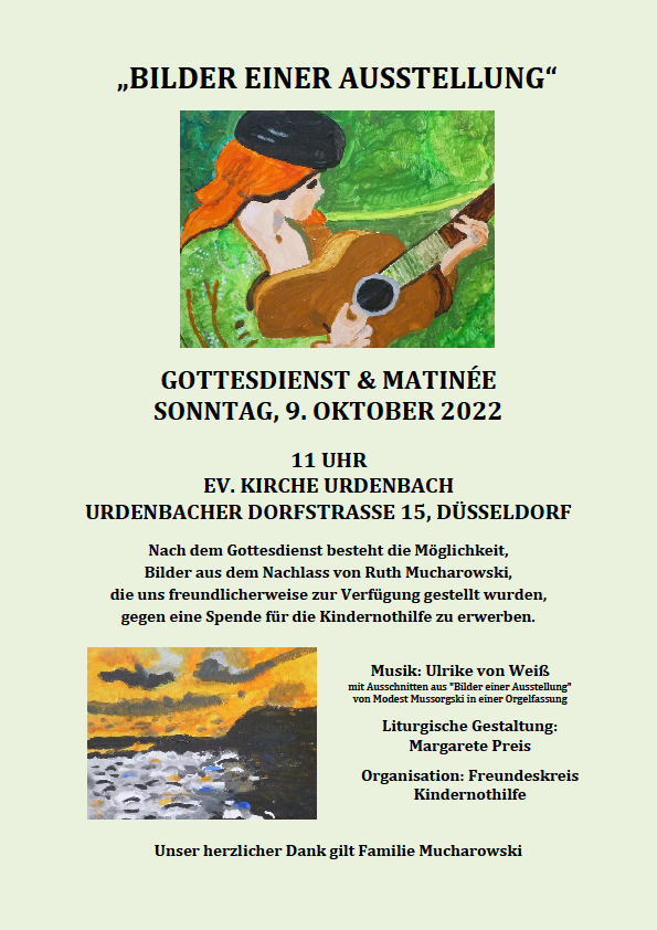 „Bilder einer Ausstellung“: Gottesdienst & Matinée am Sonntag (9.10.2022) um 11 Uhr Nach dem Gottesdienst besteht die Möglichkeit, Bilder aus dem Nachlass von Ruth Mucharowski gegen eine Spende für die Kindernothilfe zu erwerben.