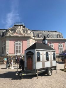 „Wie im Himmel, so auf Erden“ – so hieß das Motto des diesjährigen Himmelfahrtsgottesdienstes der Gemeinden Benrath, Düsseldorf-Süd, Garath und Urdenbach. Auf Grund der aktuellen Vorgaben konnte der Gottesdienst nicht wie die Jahre zuvor auf den Stufen des Benrather Schlosses gemeinsam mit den Bläsern gefeiert werden. Also wurde ein anderes Konzept ausprobiert und viele Gemeindeglieder machten sich bei strahlendem Sonnenschein auf den Pilgerweg rund um den Spiegelweiher. Der Gottesdienst war in vier Stationen aufgeteilt, an denen zu Beginn Pfarrer Florian Specht das Eingangsvotum und einen Psalm sprach. Bei Pfarrer Hilbrans aus Garath lauschten die Kleingruppen, die mit bis zu 5 Personen ihre Runde drehten,