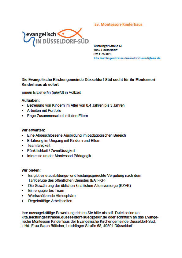 Die Evangelische Kirchengemeinde Düsseldorf-Süd sucht für ihr Montessori-Kinderhaus ab sofort: Eine/n Erzieher/in (m/w/d) in Vollzeit