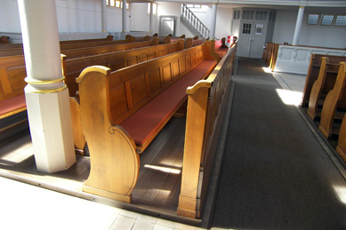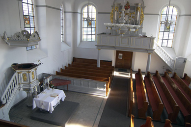 Im Innenbereich erwarten den Besucher in U-Form angeordnete Sitzbänke, die den Altarbereich, die Kanzel und das Taufbecken in ihre Mitte nehmen. Auch diese Sitzanordnung trägt zur besonderen Atmosphäre dieser Kirche bei. Gegenüber der Orgelempore befindet sich eine weitere Empore für Besucher oder Chor. Die Holzelemente an Geländern, Emporensäulen, Kanzel etc. zeigen schöne Drechselarbeiten und Formen, sind harmonisch gestrichen und zeigen Elemente des Barockstiles.