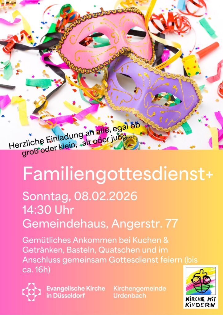 Herzliche Einladung zum Familiengottesdienst am Sonntag, den 08.02.2026 um 14:30 Uhr im Gemeindehaus, Angerstr. 77. Beginn gemütlich bei Kaffee/Apfelschorle und Kuchen, es gibt ein Bastelangebot für Kinder. Im Anschluss gemeinsam Gottesdienst feiern.