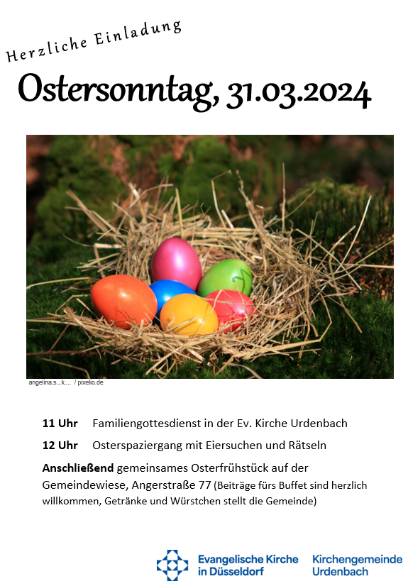Familiengottesdienst am Ostersonntag Am Ostersonntag, den 31.03.2024 feiern wir gemeinsam Familiengottesdienst um 11 Uhr in der Ev. Kirche Urdenbach. Anschließend sind Sie noch herzlich zum Osterspaziergang und Osterfrühstück auf der Gemeindewiese eingeladen!