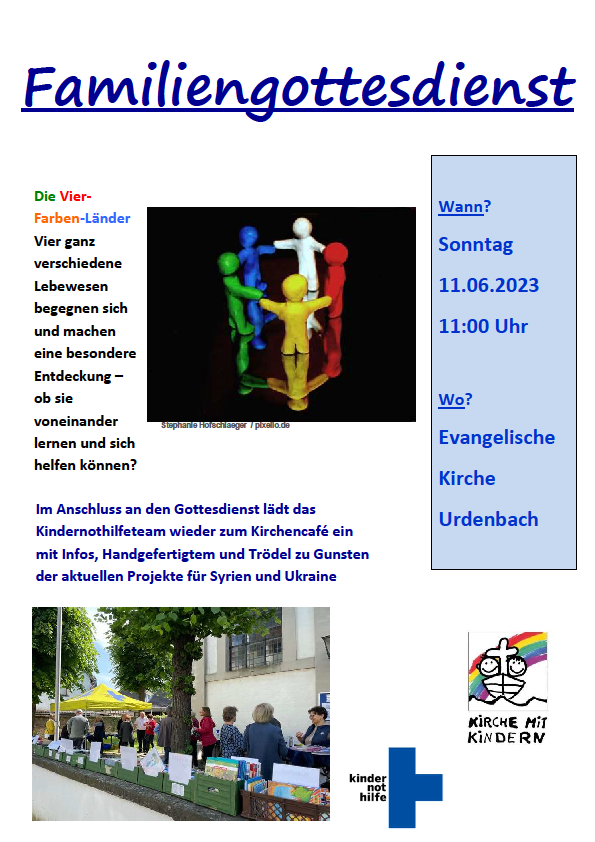 Am kommenden Sonntag feiern wir Familiengottesdienst um 11 Uhr in der Ev. Kirche Urdenbach. Im Anschluss lädt das Kindernothilfeteam zu Kirchencafé mit Infos und Trödel ein.