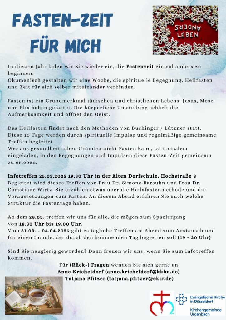 Auch in diesem Jahr wird es wieder eine besonders gestaltete ökumenische Aktion in der Fastenzeit geben. Eine Woche spirituelle Begegnung kombiniert mit Heilfasten und Zeit für sich selber. Am 25.03.2025 findet um 19:30 Uhr ein Infoabend in der Alten Dorfschule, Hochstraße 8 statt, wo der genaue Ablauf und das Heilfasten erklärt wird.