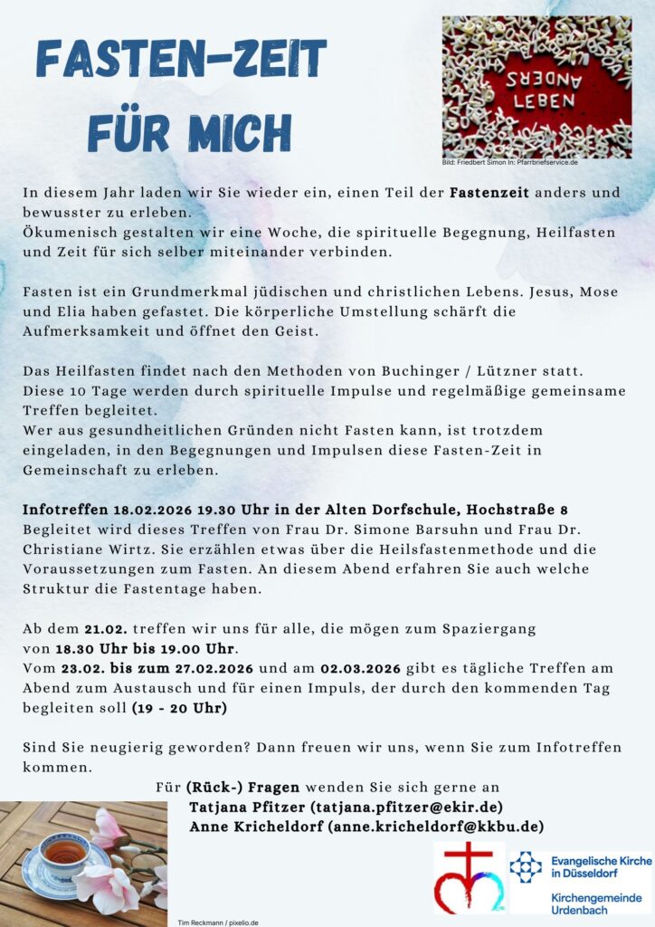 Auch in diesem Jahr wird es wieder eine Ökumenische Aktion in der Fastenzeit geben. Eine Woche Heilfasten nach Buchinger in Gemeinschaft begleitet durch spirituelle Impulse.