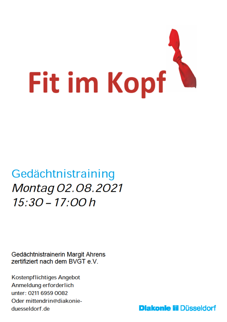 Ab dem 2. August 2021 wird im seniorengerechten Quartier Urdenbach an der Südallee 98 von 15.30 – 17.00 Uhr ein neuer kostenpflichtiger Kurs zum Gedächtnistraining angeboten.