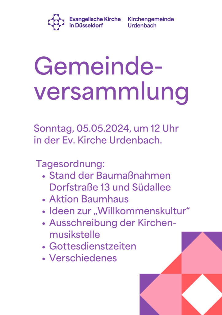 Gemeindeversammlung am 05.05.2024 um 12 Uhr in der Ev. Kirche Urdenbach