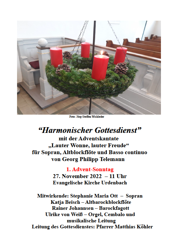 “Harmonischer Gottesdienst” mit der Adventskantate „Lauter Wonne, lauter Freude“ für Sopran, Altblockflöte und Basso continuo von Georg Philipp Telemann.
