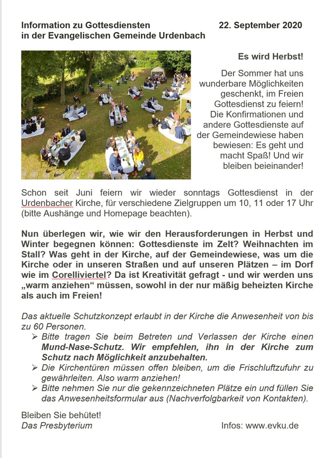 Informationen zu Gottesdiensten Bitte beachten Sie unsere weitere Planung und die aktuellen Informationen zu den Gottesdiensten.