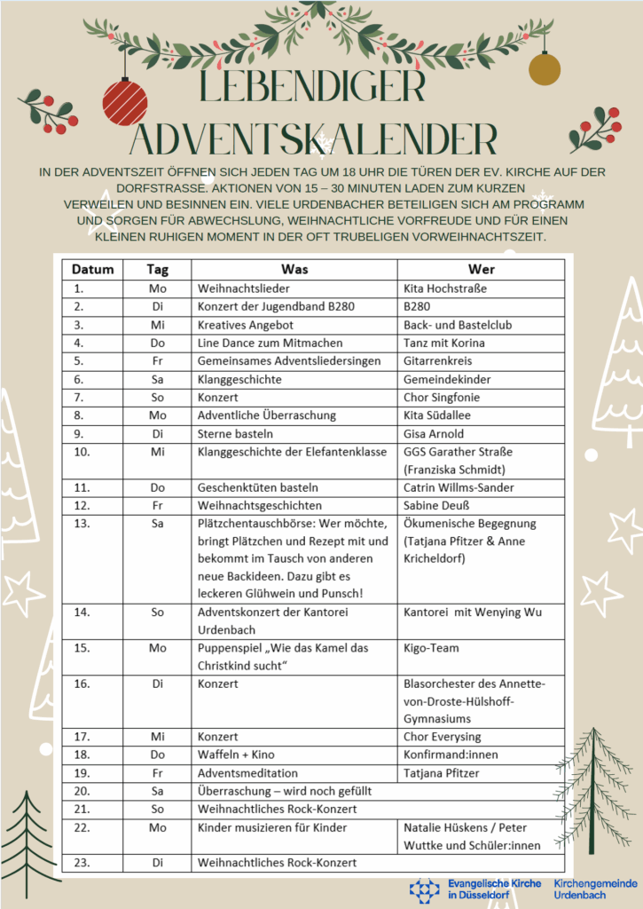 Anbei finden Sie das diesjährige Programm unseres Lebendigen Adventskalenders. Jeden Tag um 18 Uhr gibt es in der Adventszeit eine neue kleine Aktion zum Erleben, Genießen, Mitmachen… Kommen Sie vorbei und erfreuen sich an den abwechslungsreichen Aktionen für alle Altergruppen!