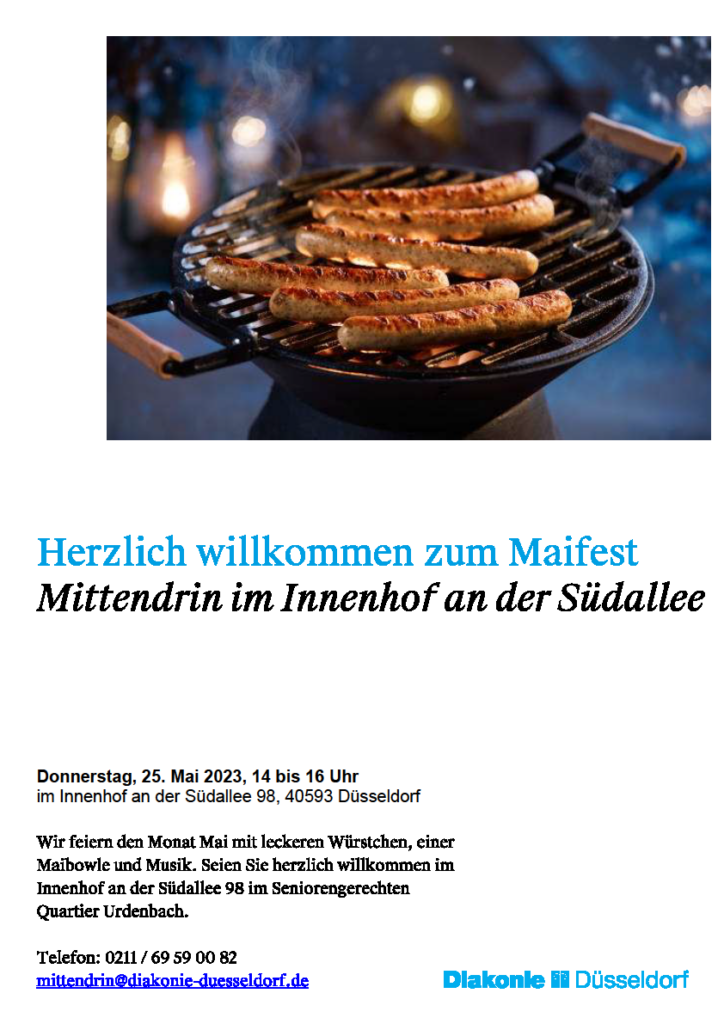 mittendrin – Seniorengerechtes Quartier Urdenbach – Maifest Am Donnerstag, 25. Mai 2023 will auch das Seniorengerechte Quartier Urdenbach (SeQU) den Mai willkommen heißen. Herzliche Einladung dazu! Für Essen und Trinken ist gesorgt – gute Laune darf gerne in unbegrenzter Menge mitgebracht werden.