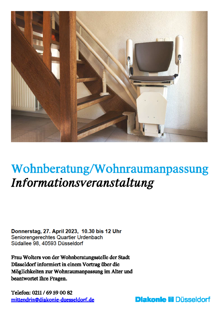 Am Donnerstag, 27. April 2023 gibt es im Seniorengerechten Quartier Urdenbach (SeQU) eine Informationsveranstaltung zu den Möglichkeiten der seniorengerechten Umgestaltung von Wohnraum. Sie erfahren, wie man (s)eine Wohnung seniorentauglich gestalten kann, wo es Hilfen dazu gibt, und welche Fördermöglichkeiten bestehen. Referentin ist Frau Wolters von der Wohnberatungsstelle der Stadt Düsseldorf.