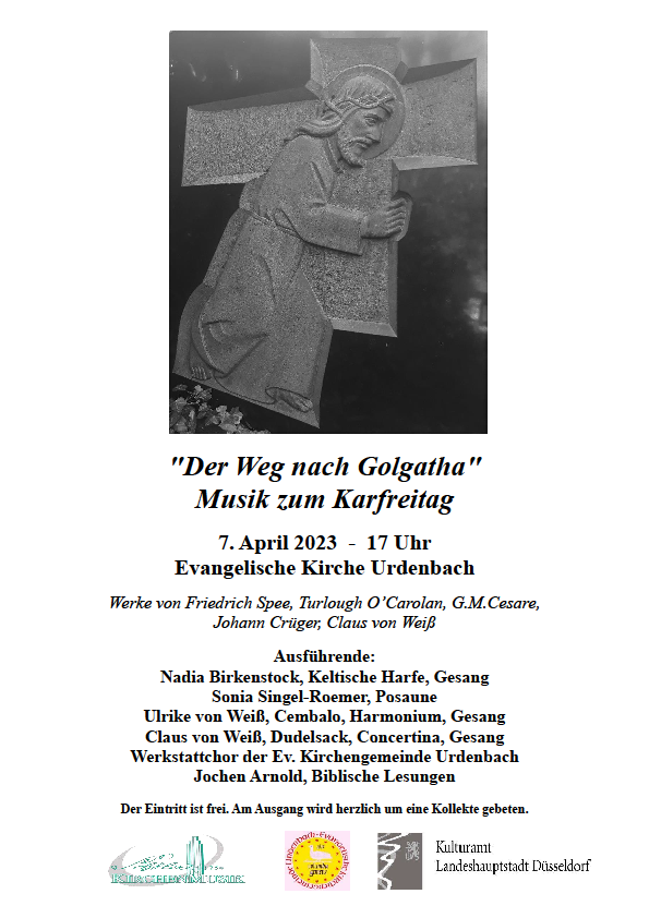 Auch in diesem Jahr findet wieder die traditionelle „Musik zum Karfreitag“ statt. Am 7. April 2023 um 17:00 Uhr werden unter der Leitung von Ulrike von Weiß in der Ev. Kirche Urdenbach Vokal- und Instrumentalwerke von Johann Crüger, Friedrich Spee, Francois Couperin, Giovanni M. Caesare, Claus von Weiß u.a. aufgeführt.