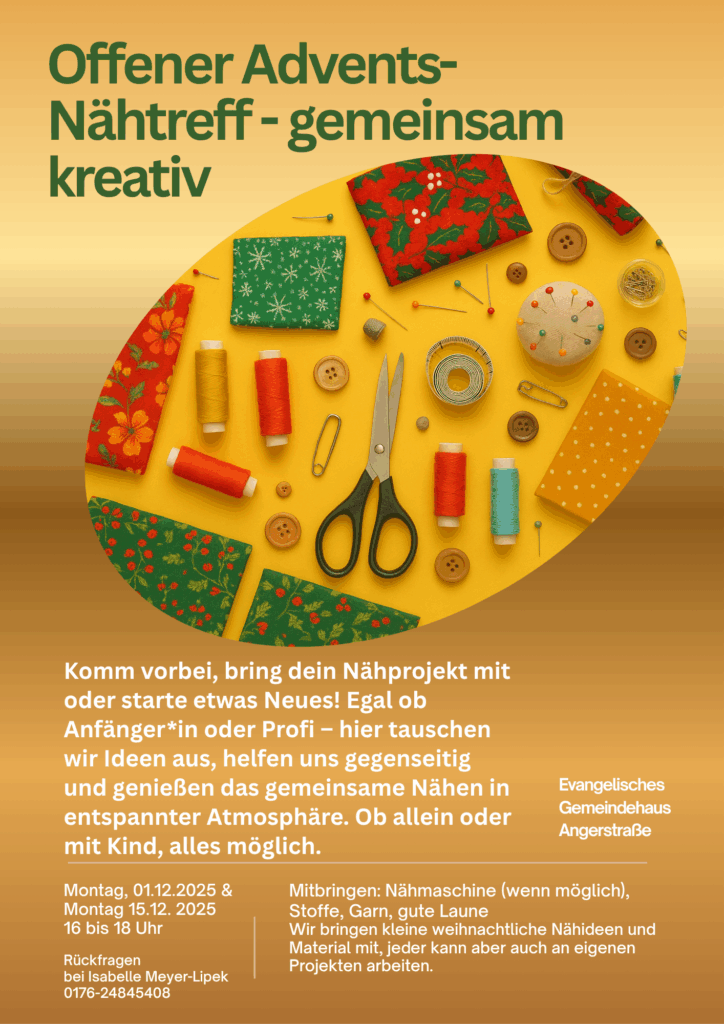 Nähtreff montags 16 – 18 Uhr Im Dezember gibt es am 01. und 15. ein neues Angebot im Jugendraum – den offenen Advents-Nähtreff. Für alle, die Spaß am Nähen haben oder ein paar Tipps gebrauchen können.
