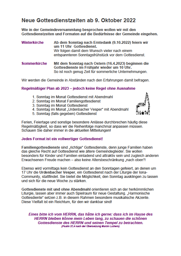 Neue Gottesdienstzeiten ab 9. Oktober 2022 Ab 09.10.2022 gibt es neue Gottesdienstzeiten, die Winterkirche beginnt.