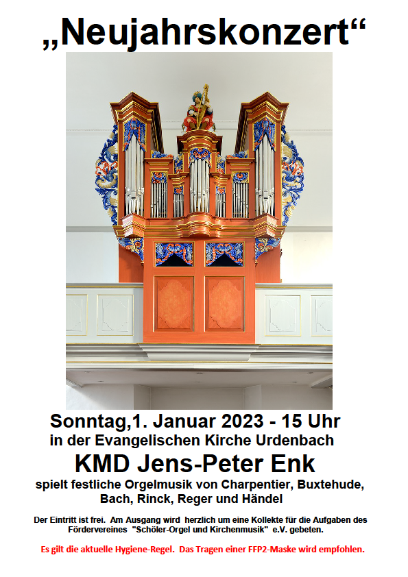 Neujahrskonzert am 01.01.2023 um 15 Uhr in der Dorfkirche KMD Jens-Peter Enk spielt festliche Orgelmusik von Charpentier, Buxtehude, Bach, Rinck, Reger und Händel.