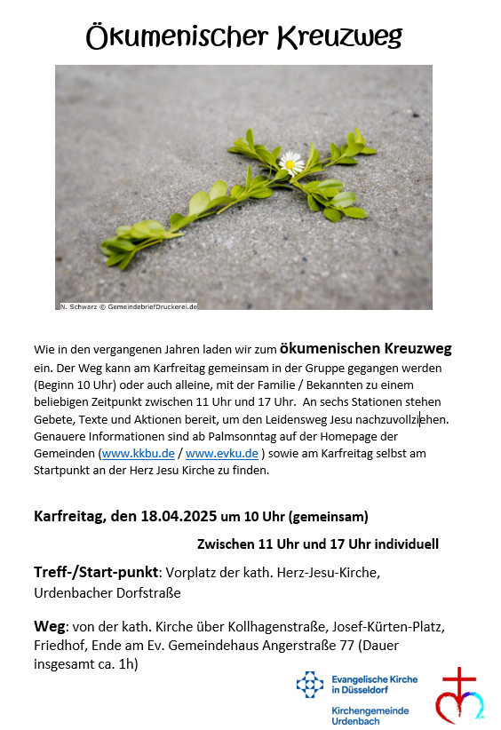 Start ist an der katholischen Kirche Herz Jesu in Urdenbach. Dauer des gemeinsamen Weges ca. 1 1/2 Stunden.