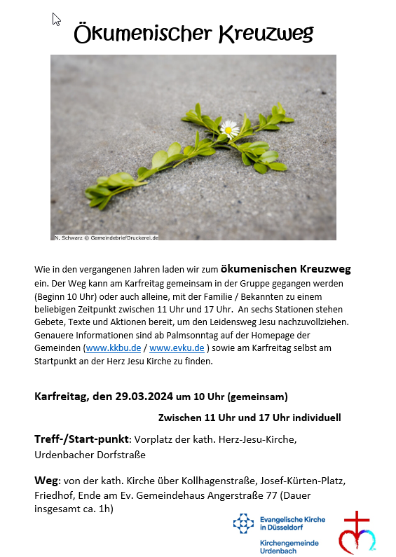 Wie in den vergangenen Jahren laden wir zum ökumenischen Kreuzweg ein. Der Weg kann am Karfreitag gemeinsam in der Gruppe gegangen werden (Beginn 10 Uhr) oder auch alleine, mit der Familie / Bekannten zu einem beliebigen Zeitpunkt zwischen 11 Uhr und 17 Uhr.