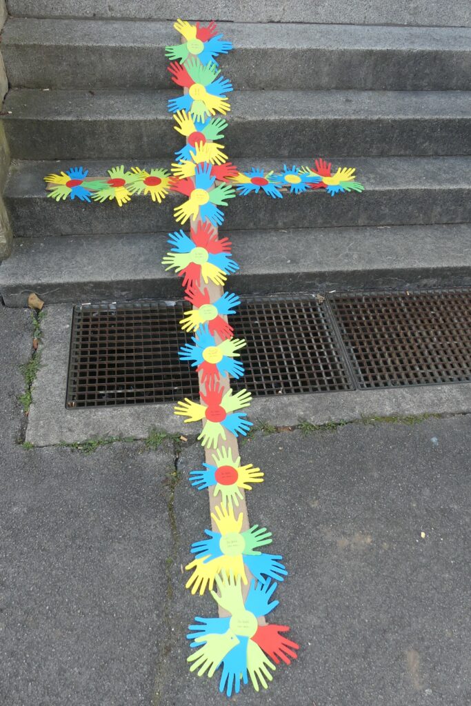 Das Leitmotiv unter dem der diesjährige Kreuzweg stand – Hände. Hände, in ihrer ganz unterschiedlichen Form, Kraft, Wesensart – kraftvoll, helfend, annehmend, leblos. Die Hände der Teilnehmenden haben das Kreuz zum blühen gebracht – ein Zeichen der Hoffnung.