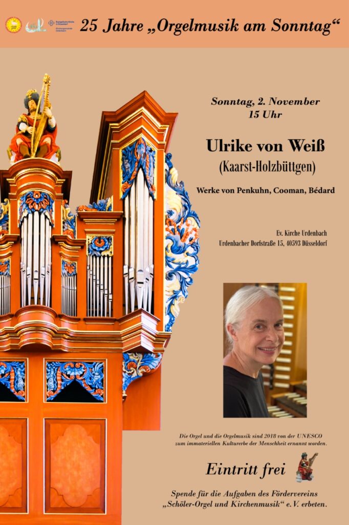 Orgelmusik am Sonntag, 02.11.2025 Herzliche Einladung zur Orgelmusik am Sonntag kommenden Sonntag um 15 Uhr in der Ev. Kirche Urdenbach. Es spielt Ulrike von Weiß.
