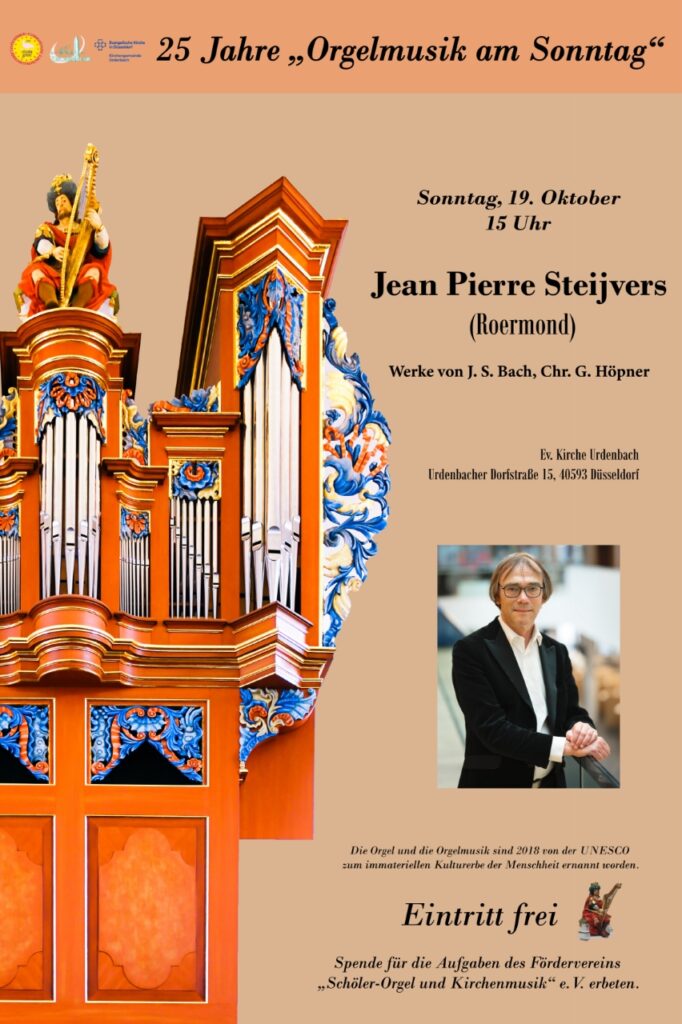Orgelmusik am Sonntag, 19.10.2025 Herzliche Einladung zur Orgelmusik am Sonntag! In diesem Monat auf Grund des Erntedankfestes nicht am ersten Sonntag im Monat, aber sie findet statt, mit einem Organisten aus Roermond Jean Pierre Steijvers.