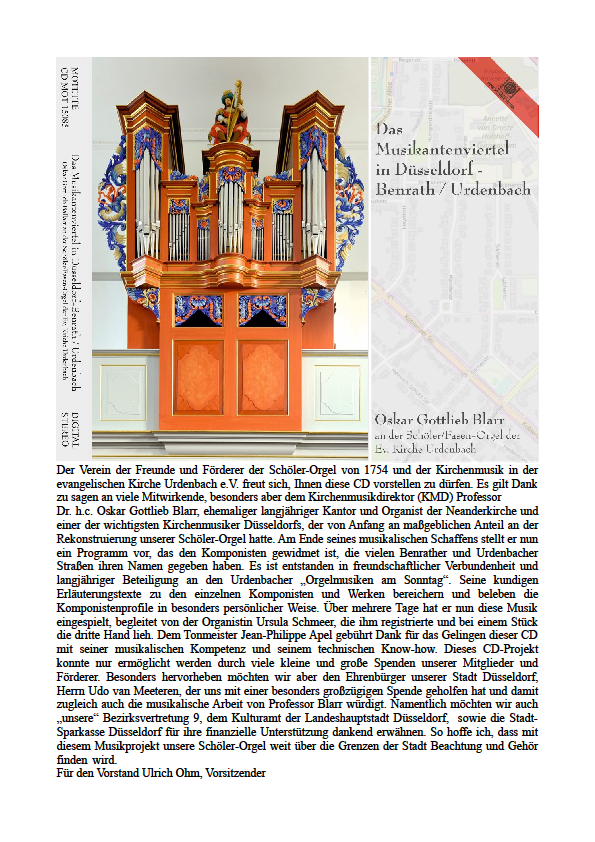 Die von Oskar Blarr eingespielte CD mit Orgelmusik der Komponisten aus dem Benrather Musikantenviertel ist weiterhin im Gemindebüro oder bei den Konzerten in der Kirche erhältlich.