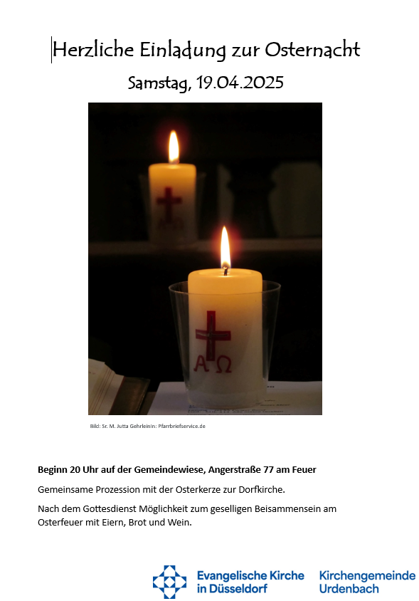 Beginn ist um 20 Uhr am Feuer auf der Gemeindewiese. Danach geht es mit der entzündeten Osterkerze in die Kirche. Im Anschluss an den Gottesdienst gibt es auf der Gemeindewiese am Feuer Brot, Wein und Eier als geselligen Ausklang.