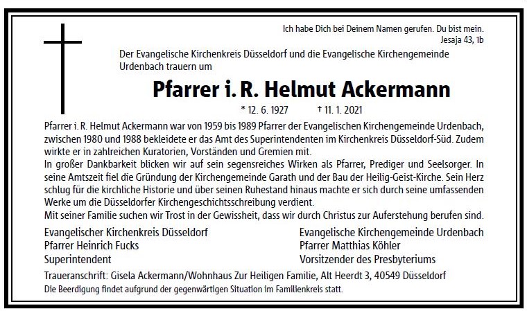 Wir trauern mit seinen Angehörigen und werden ihm ein ehrendes Angedenken bewahren. Seine letzte Ruhestätte findet Pfarrer Ackermann auf dem Friedhof der Gemeinde Urdenbach.