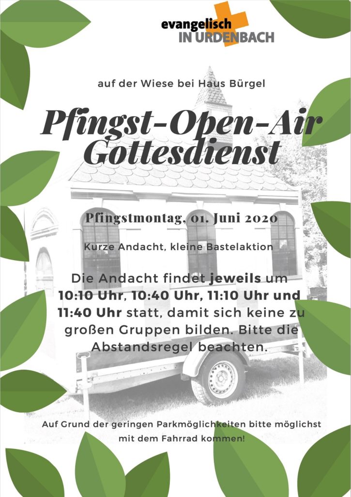 Am Pfingstmontag (01.06.2020) wird es einen Pfingst-Open-Air-Gottesdienst auf der Wiese bei Haus Bürgel mit einer kurzen Andacht und einer kleinen Bastelaktion geben.
