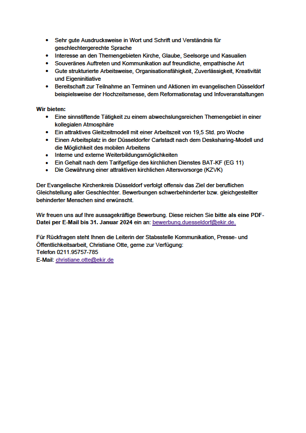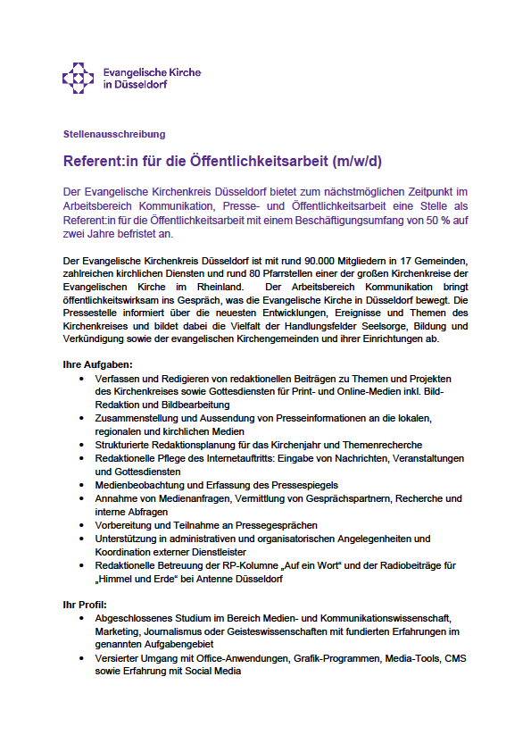 Referent:in für die Öffentlichkeitsarbeit (m/w/d) Hier geht es zur Stellenausschreibung direkt auf der Seite der Evangelischen Kirche in Düsseldorf.