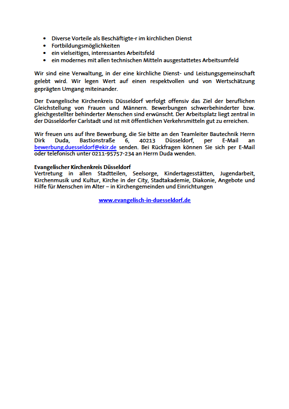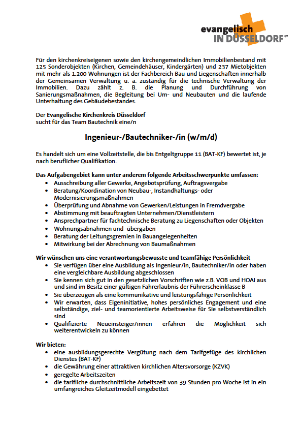 Für den kirchenkreiseigenen sowie den kirchengemeindlichen Immobilienbestand mit 125 Sonderobjekten (Kirchen, Gemeindehäuser, Kindergärten) und 237 Mietobjekten mit mehr als 1.200 Wohnungen ist der Fachbereich Bau und Liegenschaften innerhalb der Gemeinsamen Verwaltung u. a. zuständig für die technische Verwaltung der Immobilien. Dazu zählt z. B. die Planung und Durchführung von Sanierungsmaßnahmen, die Begleitung bei Um- und Neubauten und die laufende Unterhaltung des Gebäudebestandes.