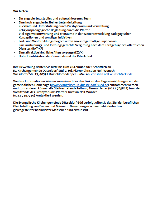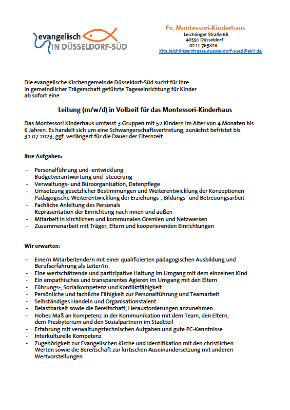 Die evangelische Kirchengemeinde Düsseldorf-Süd sucht für ihre in gemeindlicher Trägerschaft geführte Tageseinrichtung für Kinder ab sofort eine Leitung (m/w/d) in Vollzeit für das Montessori-Kinderhaus.