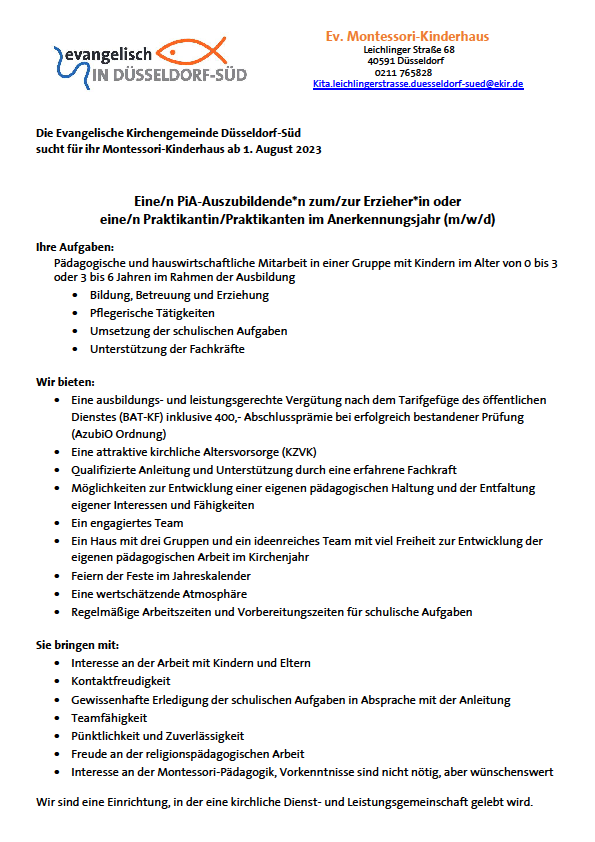 Die Evangelische Kirchengemeinde Düsseldorf-Süd sucht für ihr Montessori-Kinderhaus ab 1. August 2023 eine/n PiA-Auszubildenden zum/zur Erzieherin oder eine/n Praktikantin/Praktikanten im Anerkennungsjahr (m/w/d).