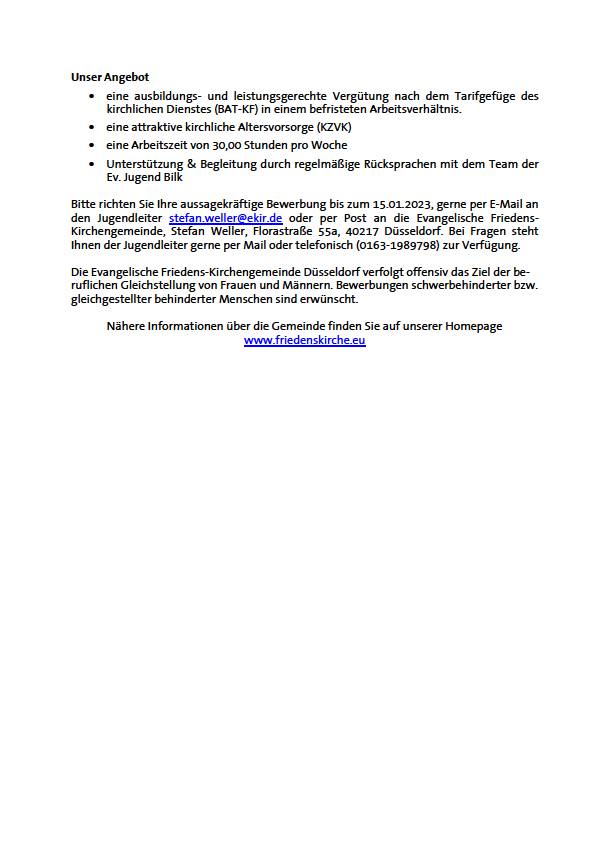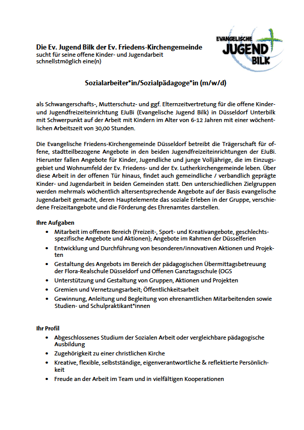 Die Ev. Jugend Bilk der Ev. Friedens-Kirchengemeinde sucht für seine offene Kinder- und Jugendarbeit schnellstmöglich eine(n) Sozialarbeiter*in/Sozialpädagoge*in (m/w/d) als Schwangerschafts-, Mutterschutz- und ggf. Elternzeitvertretung für die offene Kinder- und Jugendfreizeiteinrichtung EJuBi (Evangelische Jugend Bilk) in Düsseldorf Unterbilk mit Schwerpunkt auf der Arbeit mit Kindern im Alter von 6-12 Jahren mit einer wöchentlichen Arbeitszeit von 30,00 Stunden.