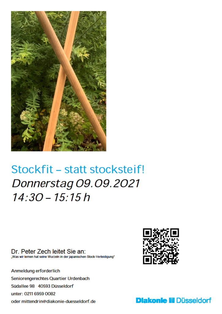 Stockfit – statt stocksteif! 09.09.2021 Das seniorengerechte Quartier Urdenbach „mittendrin“ lädt ein zu einer Einführung „Bewegung mit dem Stock“ unter qualifizierter Anleitung in der Südallee 98. Anmeldung erforderlich! Einzelheiten entnehmen Sie bitte dem Flyer.