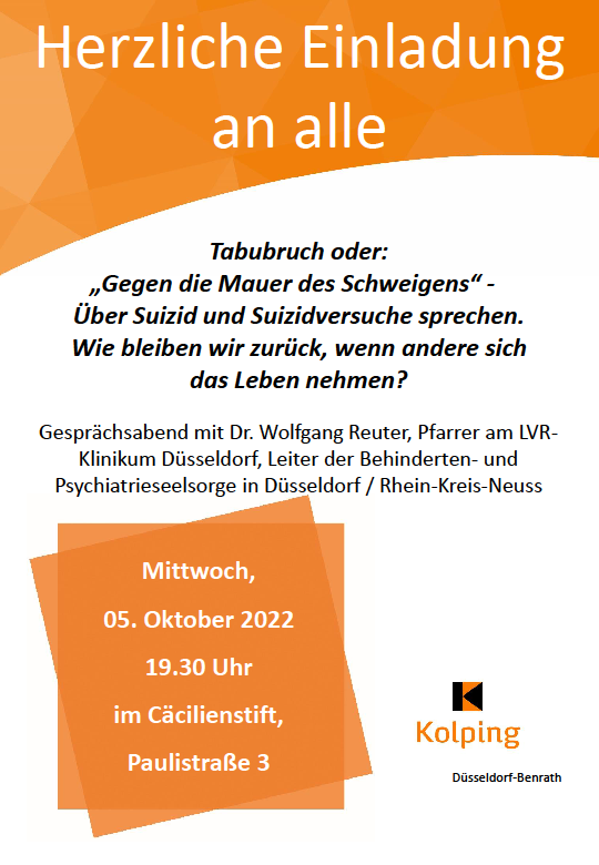 Alle Interessierten sind herzlich zu einem Gesprächsabend mit Dr. Wolfgang Reuter, Pfarrer am LVR-Klinikum Düsseldorf, Leiter der Behinderten- und Psychiatrieseelsorge in Düsseldorf / Rhein-Kreis-Neuss eingeladen zum Thema: Tabubruch oder: „Gegen die Mauer des Schweigens“ – Über Suizid und Suizidversuche sprechen. Wie bleiben wir zurück, wenn andere sich das Leben nehmen?