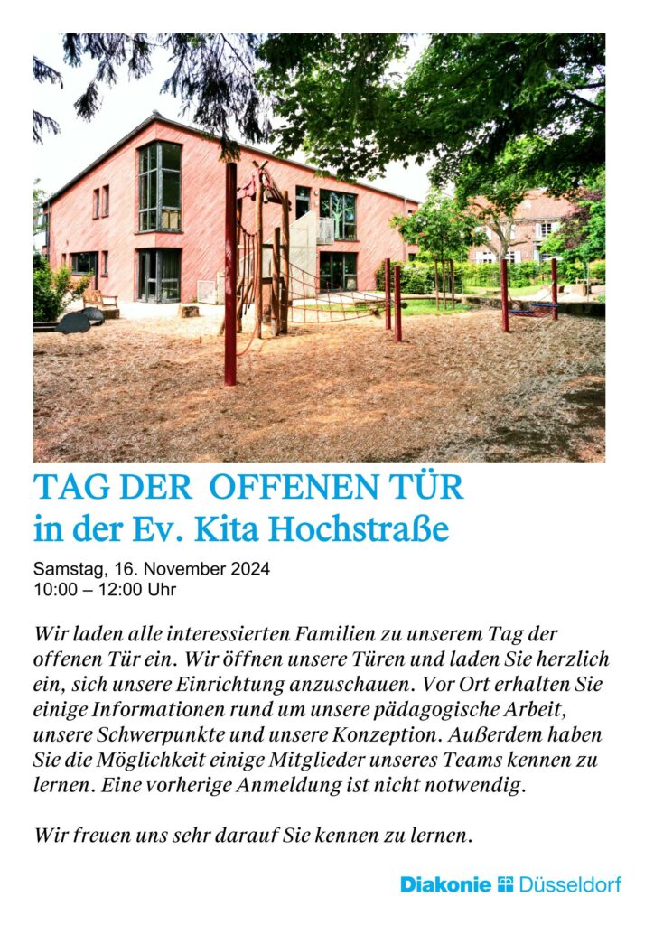 Herzliche Einladung jetzt am Samstag, den 16.11.2024 zum Tag der offenen Tür in die Ev. Kindertagesstätte auf der Hochstraße. Von 10 -12 Uhr können Sie die Räume besichtigen und Mitglieder des Teams kennenlernen.