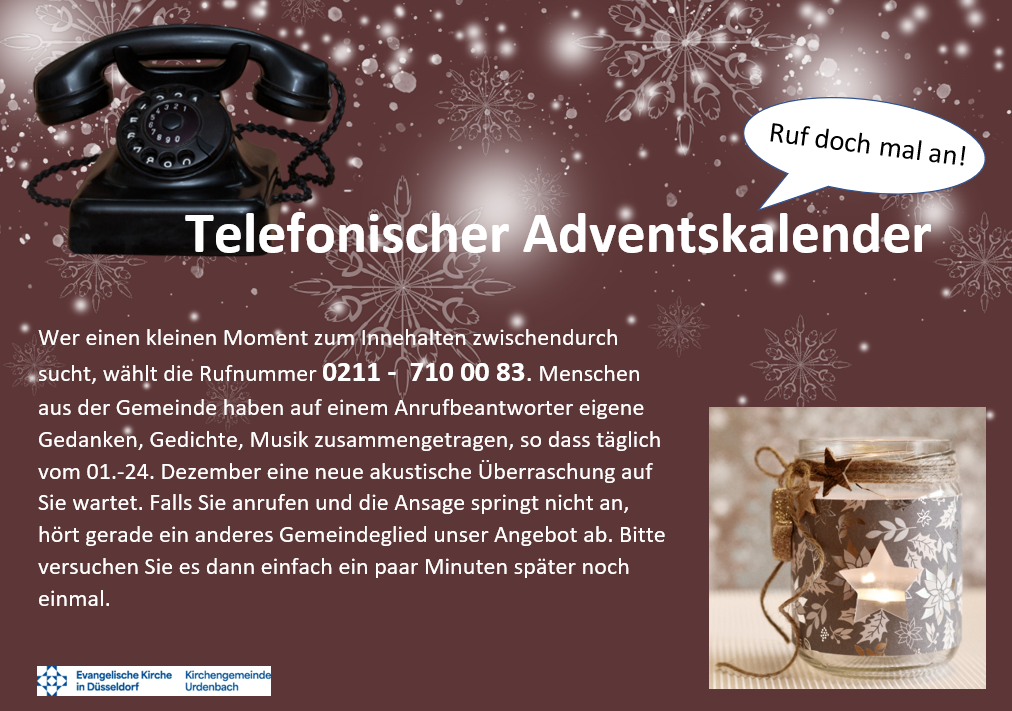 Vom 01.-24.12.2024 können Sie auch von zu Hause aus sich einen kleinen Moment Auszeit vom vorweihnachtlichen Trubel gönnen: verschiedene Gemeindeglieder haben Texte, Gedichte aufgenommen, die Sie über die Telefonnummer 0211- 710 00 83 anhören können und darüber ein wenig mit dem in Berührung kommen, was die Adventszeit uns eigentlich sein soll: eine Zeit der Erwartung und Vorfreude auf das Kommen von Gottes Sohn.