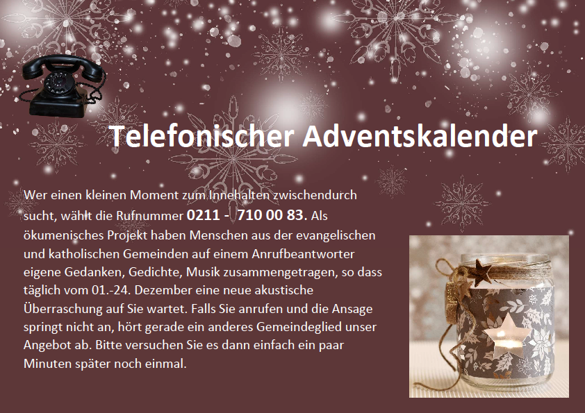 Telefonischer Adventskalender Vom 01.-24. Dezember erwartet Sie unter der unten genannten Telefonnummer jeden Tag eine kleine akustische Überraschung, um Sie durch den Advent abseits von Hektik und Stress zu begleiten!