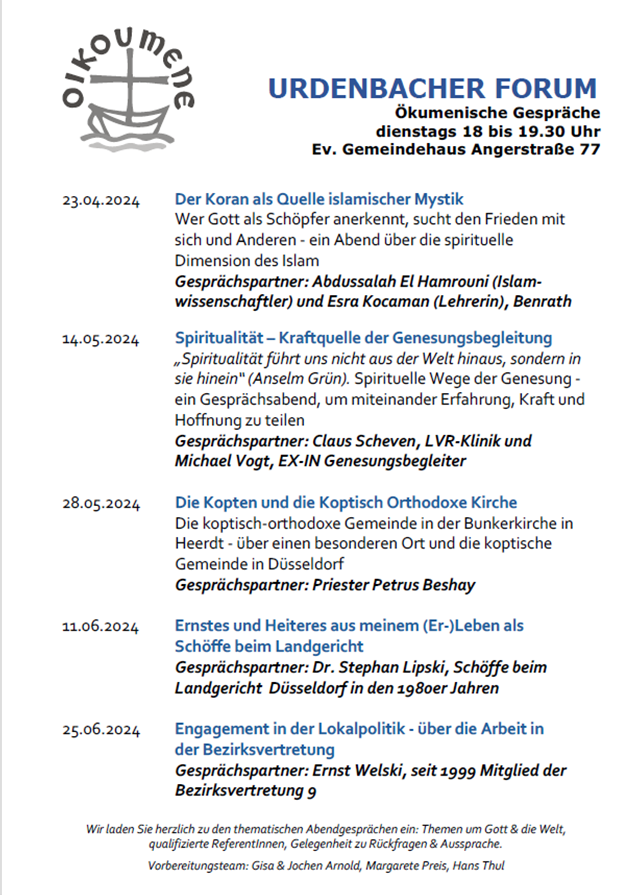 Terminübersicht Urdenbacher Forum April-Juni 2024