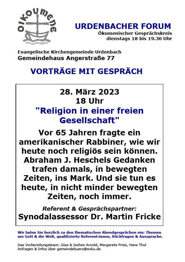 Am 28.03.2023 kommt Synodalassessor Dr. Martin Fricke zu uns in das Urdenbacher Forum. Sein Thema ist: Religion in einer freien Gesellschaft.